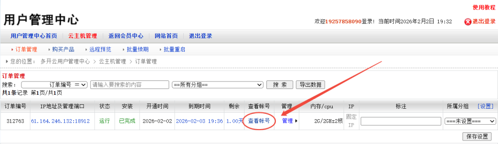 1、在选择云服务器配置开通成功后,会显示以下界面,我们点击【查看账号】