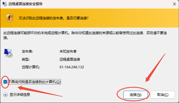 3、双击打开下载的远程桌面登录图标,如果提示安全警告,建议勾选【不再询问我是否远程连接到此计算机】并点击【连接】